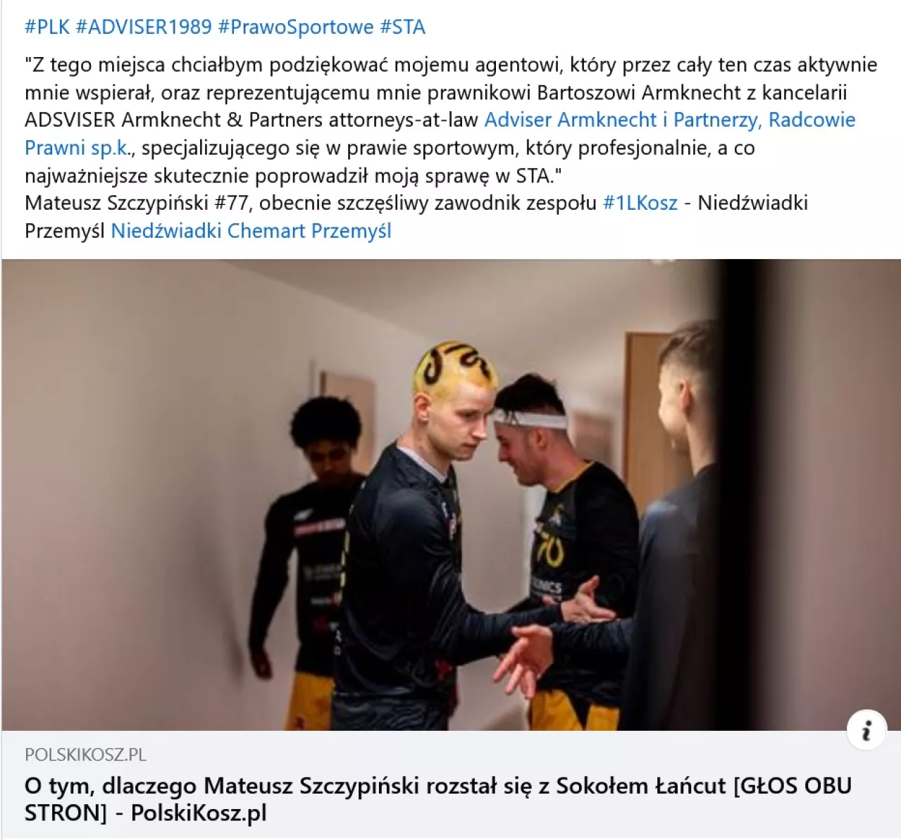 14 lutego od mojego prawnika sportowego, który mnie reprezentował w sporze prawnym z klubem otrzymałem bardzo dobrą informację, że sprawę wygrałem. Nie będę mówił o detalach, ale STA uznał moje roszczenia wobec klubu, orzekając, że mój kontrakt z Sokołem Łańcut został rozwiązany 4 stycznia 2024 r. z winy klubu. Z pisma wynika, że wyrok jest ostateczny i kończy arbitraż w sprawie. Po ponad dwóch miesiącach życia w niepewności i zawieszenia mojej kariery koszykarskiej w końcu poczułem ulgę, że jestem wolnym zawodnikiem.