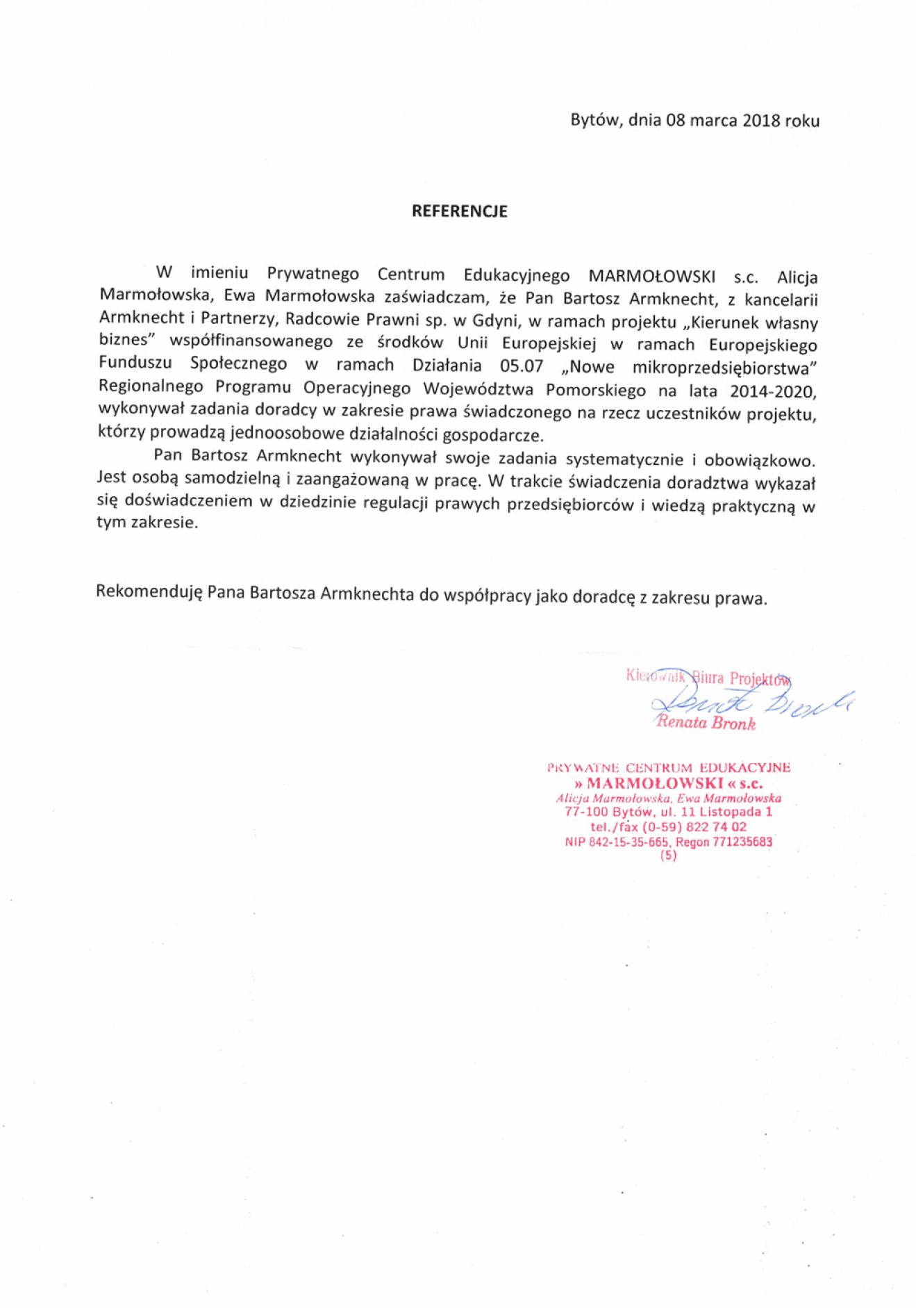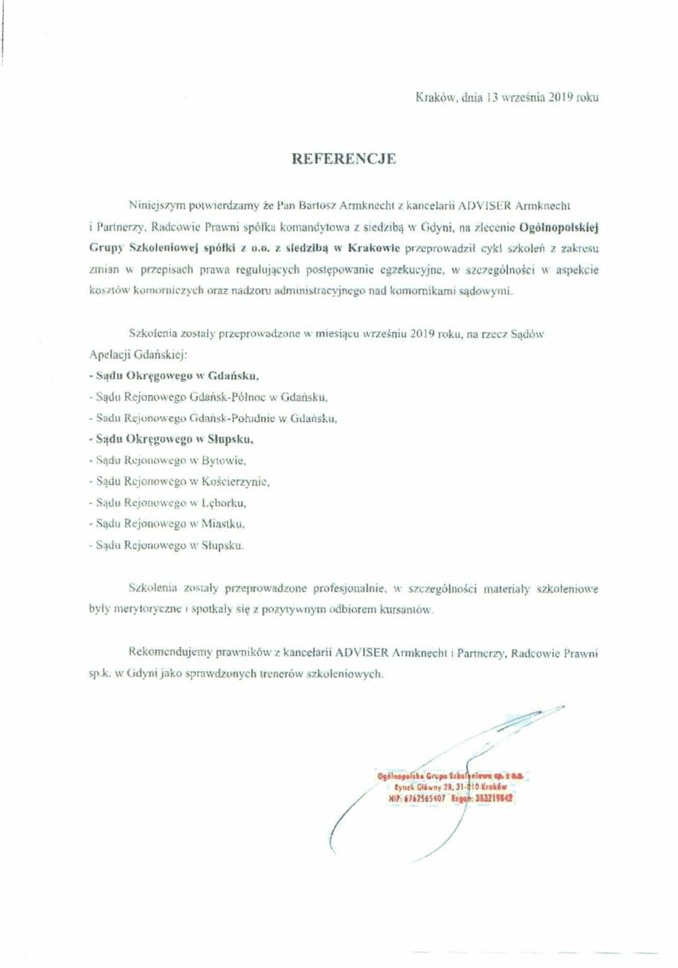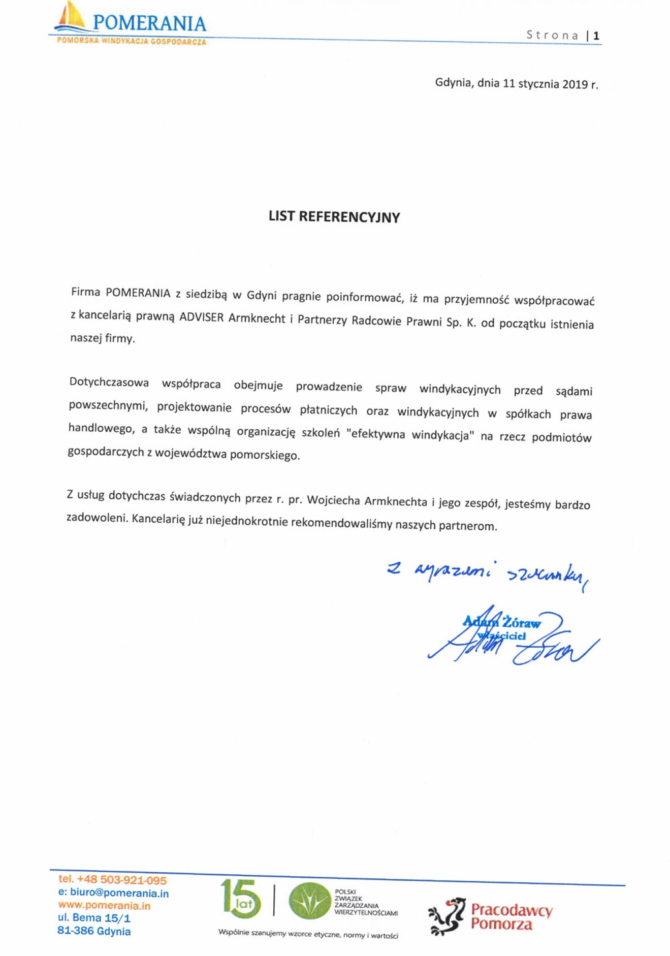 Niniejszym w imieniu ECL Euro-Cargo-Logistic Kontor GmbH z siedzibą w Hamburgu (HRB 948828), udzielam referencji prawnikom z kancelarii prawnej w Gdyni ADVISER Armknecht i Partnerzy, Radcowie Prawni sp.k. z siedzibą w Gdyni w osobach radcy prawnego Wojciecha Armknechta i Bartosza Armknechta w zakresie świadczonych usług prawnych przez kancelarię dla oddziału naszej firmy w Gdyni. Potwierdzamy, że kancelaria prawna w latach 2007-2018 prowadziła stałą obsługę prawną naszej spółki, w tym jej oddziału w Gdyni zakresie aktualnych spraw spółki, w tym: prawa transportowego, logistycznego i prawa morskiego oraz spraw korporacyjnych (prawo spółek handlowych), jak i windykacji należności. Mając na względzie rzetelne i terminowe wykonywanie usług przez prawników z kancelarii prawnej w Gdyni: ADVISER Armknecht i Partnerzy, Radcowie, niniejszych udzielamy im referencji i rekomendujemy do współpracy jako profesjonalnych doradców biznesowych i prawnych, szczególnie w obsłudze firm z branży transportowej i logistycznej.