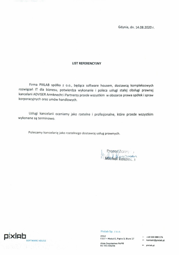 Firma PIXLAB spółka z o.o. z siedzibą w Redzie (województwo Pomorskie), będąca software housem Trójmiasto: Gdańsk, Sopot, Gdynia, dostawcą kompleksowych rozwiązań IT dla biznesu, potwierdza wykonanie i poleca usługi stałej obsługi prawnej da firm, świadczonej przez prawników, radców prawnych z kancelarii prawnej w Gdyni: ADVISER Armknecht i Partnerzy radcowie prawni przede wszystkim w obszarze prawa spółek handlowych i spraw korporacyjnych oraz umów handlowych (umowy w branży IT) oraz kontraktów zagranicznych i transakcji M&A. Usługi kancelarii oceniamy jako rzetelne i profesjonalne, które przede wszystkim wykonane są zawsze terminowo. Polecamy kancelarię prawną w Gdyni ADVISER Armknecht & Partners attorneys-at-law oraz jej prawników, adwokatów i radów prawnych, jako rzetelnego dostawcę usług prawnych dla biznesu.