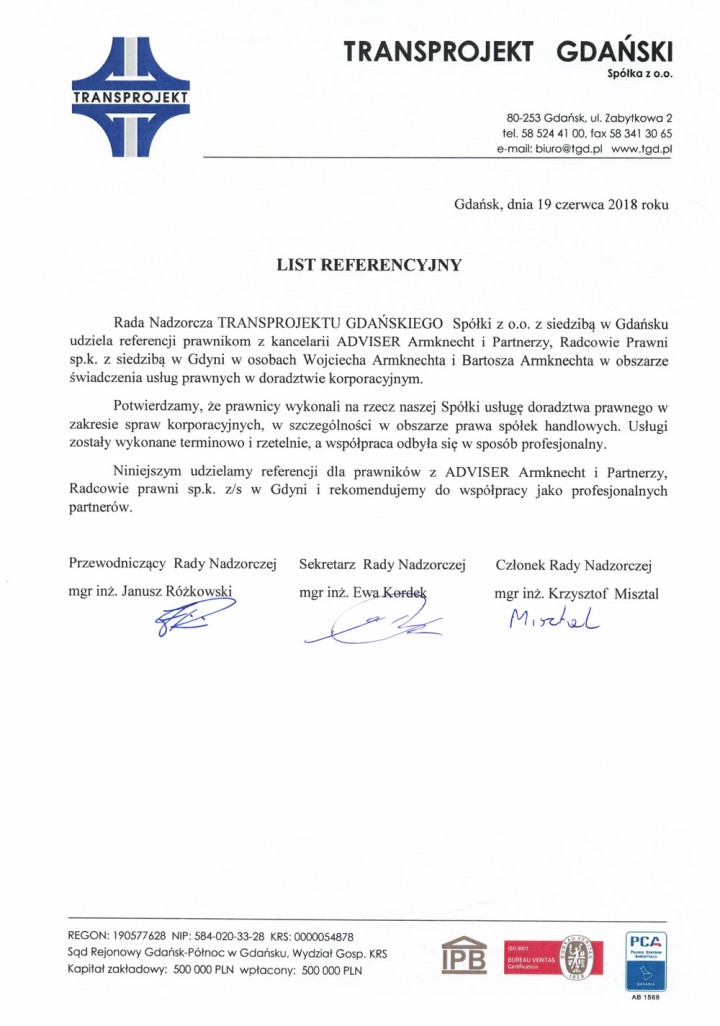 Rada Nadzorcza spółki projektowej TRANSPROJEKT GDAŃSKI Spółka z o.o. z siedzibą w Gdańsku udziela referencji prawnikom z kancelarii prawnej w Gdyni ADVISER Armknecht i Partnerzy, Radcowie Prawni sp.k. z siedzibą w Gdyni w osobach radcy prawnego Wojciecha Armknechta i Bartosza Armknechta w obszarze świadczenia usług prawnych i doradztwa korporacyjnego. Potwierdzamy, że prawnicy kancelarii wykonali na rzecz naszej Spółki usługę doradztwa prawnego w zakresie spraw korporacyjnych, w szczególności w obszarze prawa spółek handlowych. Usługi zostały wykonane terminowo i rzetelnie, a współpraca odbyła się w sposób profesjonalny. Niniejszym udzielamy referencji dla prawników z kancelarii prawnej w Gdyni: ADVISER Armknecht i Partnerzy, Radcowie prawni sp.k. z siedzibą w Gdyni i rekomendujemy tę kancelarię prawną do współpracy jako profesjonalnych partnerów obsługujących prawnie spółki i rady nadzorcze.